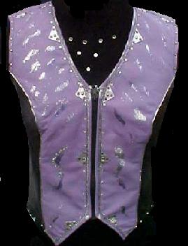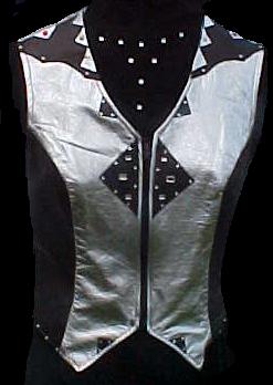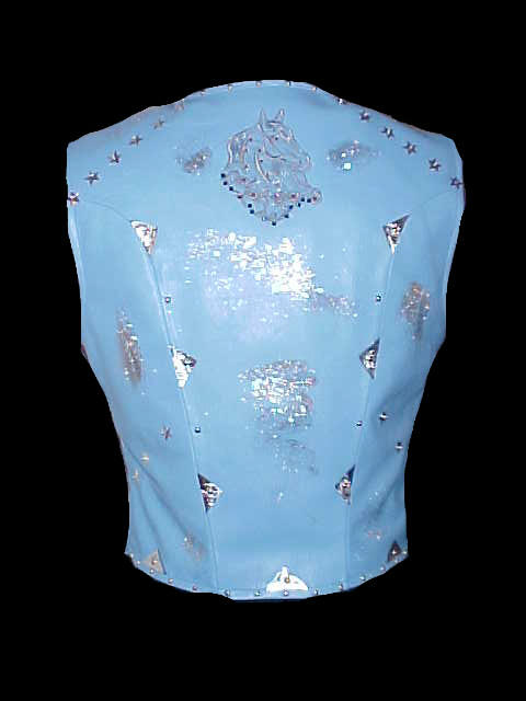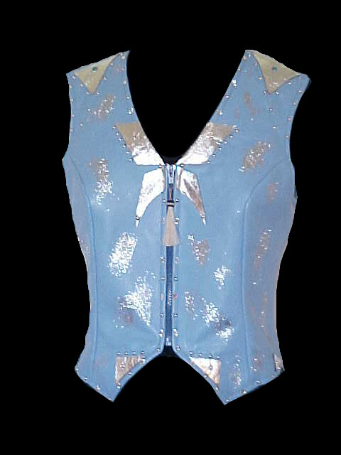 ~Item # 1006~ 325.99 ~Beautiful Pale Blue Leather vest with Silver embellishments, Silver Lame and Swarvoski Crystals, Complete with Horse Hair Tassles Back is embroidered with a beautiful Silver Horse Head~ |